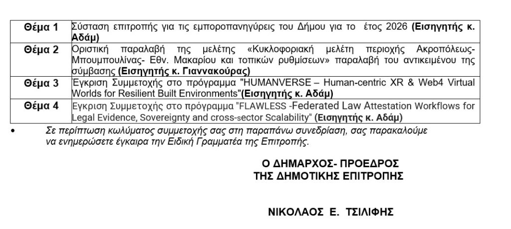 14η Πρόσκληση Συνεδρίασης Δημοτικής Επιτροπής 30.03.2026 και ώρα 10:00 π.μ.