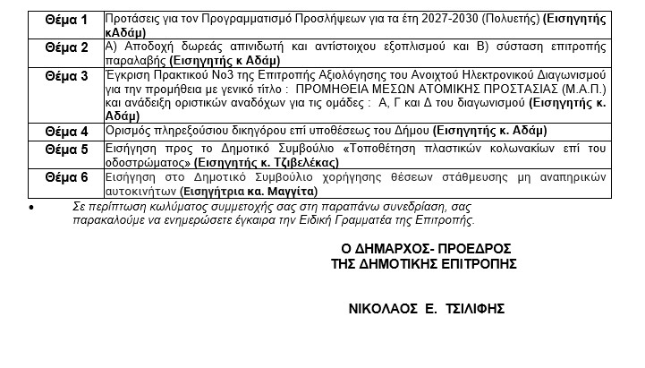 Την Μ. Τρίτη 7 Απριλίου 2026 και ώρα 10:30 σε τακτική συνεδρίαση της Δημοτικής Επιτροπής που θα γίνει στο Δημοτικό Κατάστημα Δάφνης, στο γραφείο Δημάρχου 1ος όροφος, Έλλης 16 & Κανάρη, για συζήτηση και λήψη απόφασης στα παρακάτω θέματα ημερήσιας διάταξης: