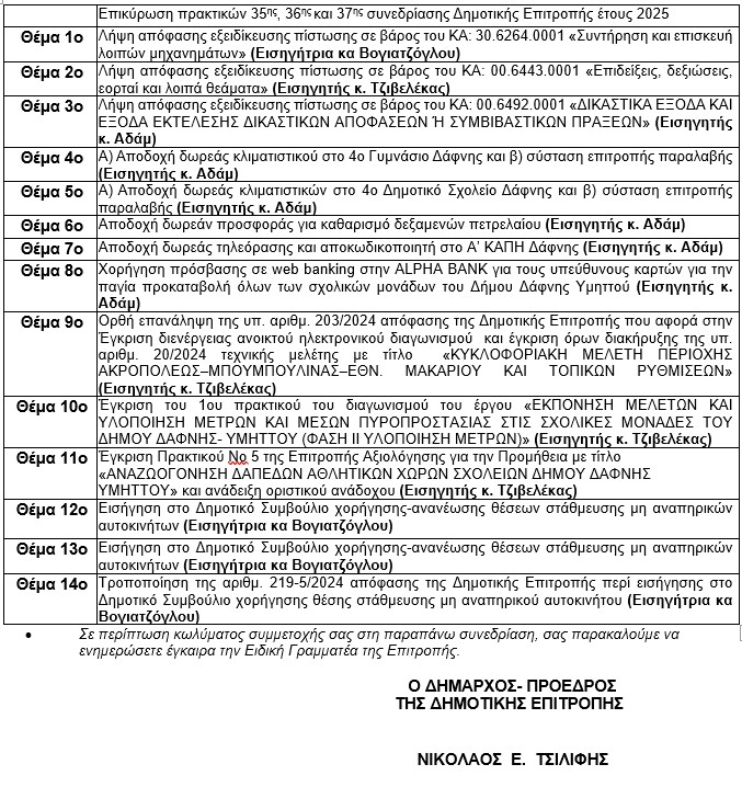 Την Παρασκευή 17 Οκτωβρίου 2025 και ώρα 10:00 π.μ., σε τακτική συνεδρίαση της Δημοτικής Επιτροπής που θα γίνει στο Δημοτικό Κατάστημα Δάφνης, στο γραφείο Δημάρχου 1ος όροφος, Έλλης 16 & Κανάρη, για συζήτηση και λήψη απόφασης στα παρακάτω θέματα ημερήσιας διάταξης: