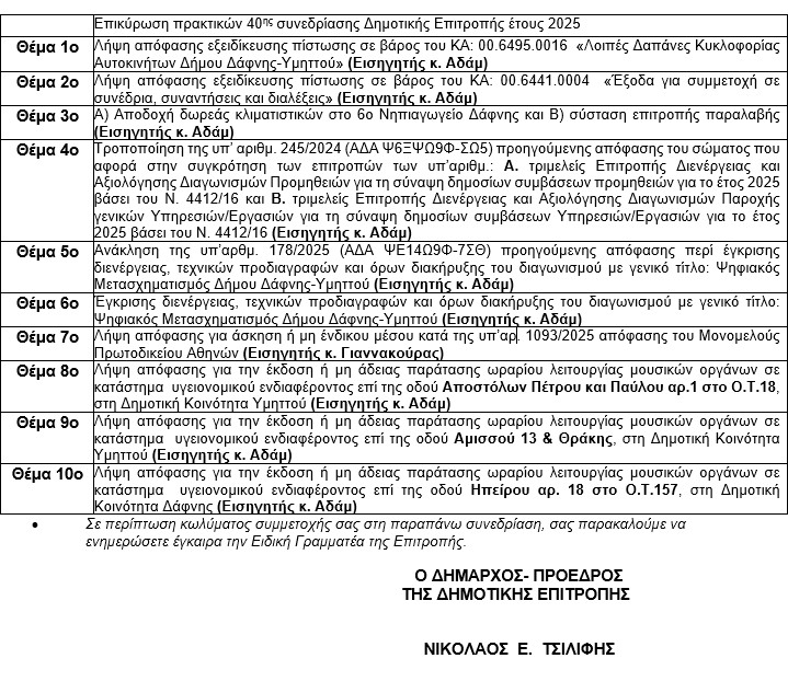 Την Τρίτη 4 Νοεμβρίου 2025 και ώρα 10:30 π.μ., σε τακτική συνεδρίαση της Δημοτικής Επιτροπής που θα γίνει στο Δημοτικό Κατάστημα Δάφνης, στο γραφείο Δημάρχου 1ος όροφος, Έλλης 16 & Κανάρη, για συζήτηση και λήψη απόφασης στα παρακάτω θέματα ημερήσιας διάταξης: