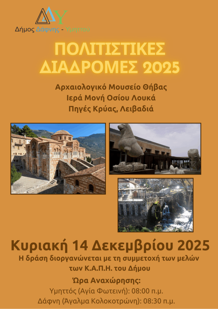 Το Τμήμα Πολιτισμού, σε συνεργασία με το Τμήμα Κοινωνικής Πολιτικής του Δήμου Δάφνης–Υμηττού, διοργανώνουν την 8η Πολιτιστική Διαδρομή την Κυριακή 14 Δεκεμβρίου 2025, προσφέροντας στα μέλη των Κ.Α.Π.Η. μια ακόμη μοναδική πολιτιστική και ιστορική εμπειρία.