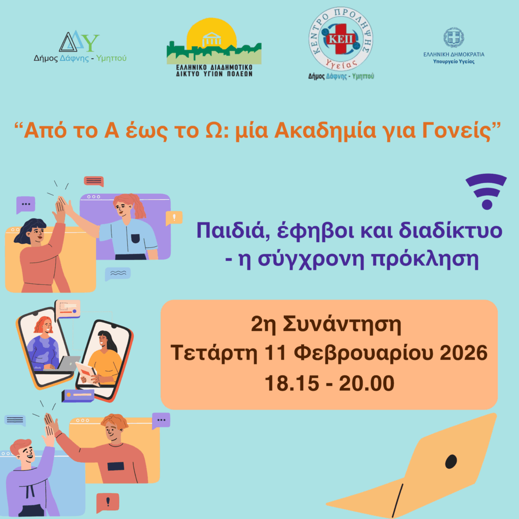 Το Ελληνικό Διαδημοτικό Δίκτυο Υγιών Πόλεων (ΕΔΔΥΠΠΥ) του Π.Ο.Υ. και ο Πρόεδρος του Γ. Πατούλης, σας καλεί να παρακολουθήσετε το φετινό κύκλο των Ακαδημιών Γονέων “Από το Α έως το Ω”, το οποίο πραγματοποιείται για 11η συνεχή χρονιά από το ΠΜΣ “Στρατηγικές Αναπτυξιακής και Εφηβικής Υγείας” της Ιατρικής Σχολής του Εθνικού και Καποδιστριακού Πανεπιστημίου Αθηνών και την Ελληνική Εταιρεία Εφηβικής Ιατρικής (Ε.Ε.Ε.Ι.). Κάθε χρόνο, παρουσιάζονται θέματα σχετικά με την υγεία, την ανάπτυξη και τη συμπεριφορά των παιδιών, τις σχέσεις στην οικογένεια και το σχολείο κ.λπ. και τελεί υπό την Αιγίδα του ΕΔΔΥΠΠΥ.