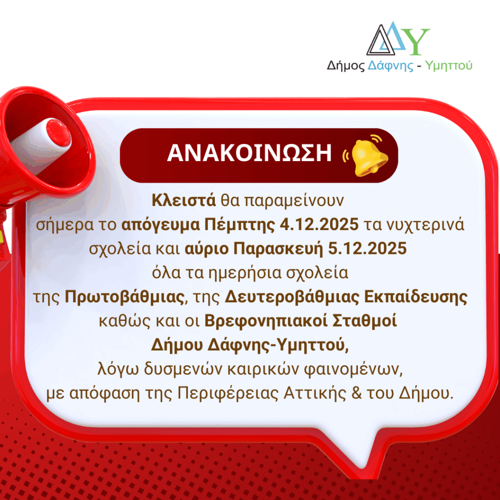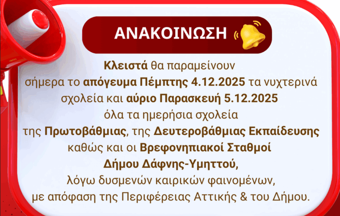 Κλειστά θα παραμείνουν σήμερα το απόγευμα Πέμπτης 4.12.2025 τα νυχτερινά σχολεία και αύριο Παρασκευή 5.12.2025 όλα τα ημερήσια σχολεία της Πρωτοβάθμιας, της Δευτεροβάθμιας Εκπαίδευσης καθώς και οι Βρεφονηπιακοί Σταθμοί Δήμου Δάφνης-Υμηττού, λόγω δυσμενών καιρικών φαινομένων, με απόφαση της Περιφέρειας Αττικής & του Δήμου.