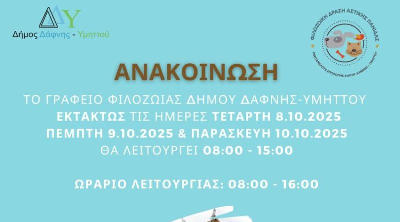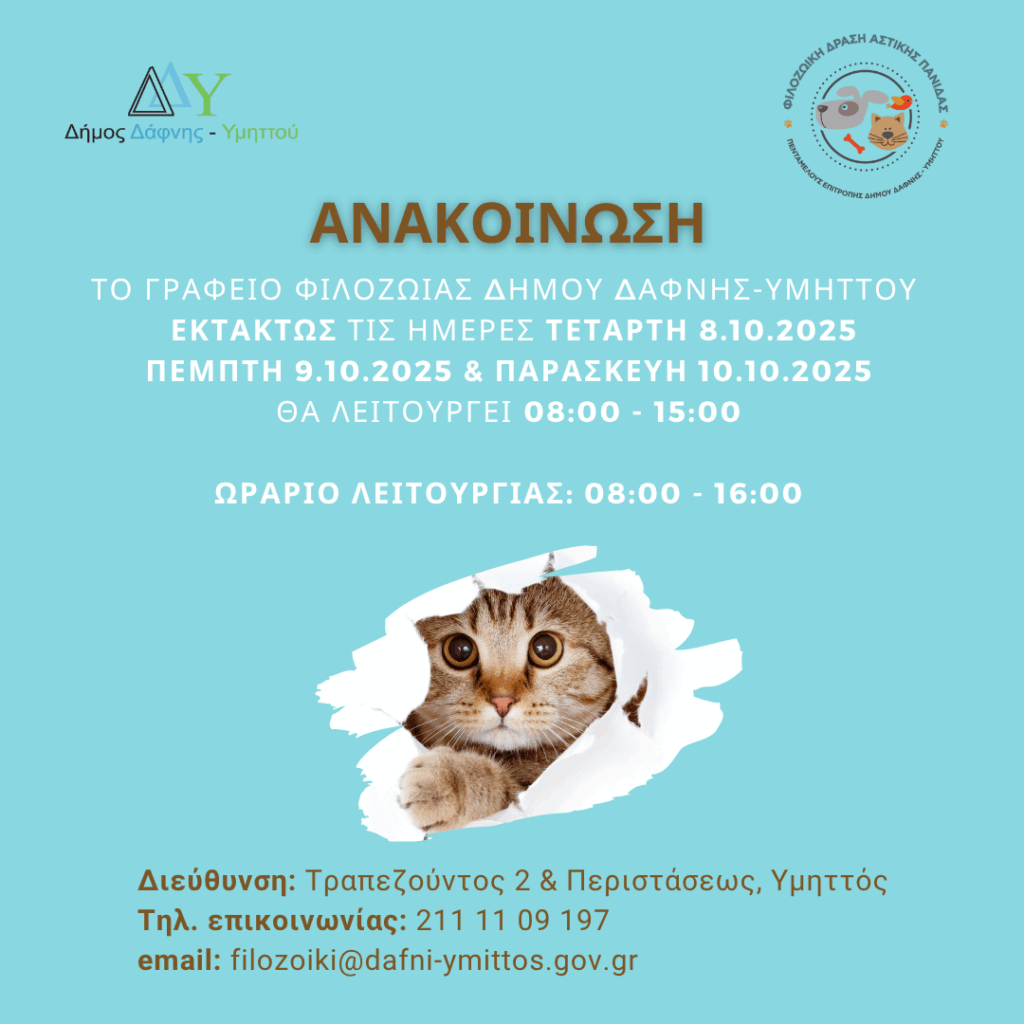 ScheduledΤΕΛΕΥΤΑΙΑ ΝΕΑ ΓΡΑΦΕΙΟ ΤΥΠΟΥ | ΑΝΑΚΟΙΝΩΣΕΙΣ ΠΕΝΤΑΜΕΛΗΣ ΕΠΙΤΡΟΠΗ ΠΑΡΑΚΟΛΟΥΘΗΣΗΣ ΤΟΥ ΕΠΙΧΕΙΡΗΣΙΑΚΟΥ ΠΡΟΓΡΑΜΜΑΤΟΣ ΔΙΑΧΕΙΡΙΣΗΣ ΑΔΕΣΠΟΤΩΝ ΖΩΩΝ ΣΥΝΤΡΟΦΙΑΣ & ΠΡΟΛΗΨΗΣ ΔΗΜΙΟΥΡΓΙΑΣ ΝΕΩΝ Τραπεζούντος 2 & Περιστάσεως, Δημοτική Ενότητα Υμηττού, Δημοτική Ενότητα Δάφνης, Δήμος Δάφνης - Υμηττού, Περιφερειακή Ενότητα Κεντρικού Τομέα Αθηνών, Περιφέρεια Αττικής, Αποκεντρωμένη Διοίκηση Αττικής, 172 37, ΕλλάδαMap