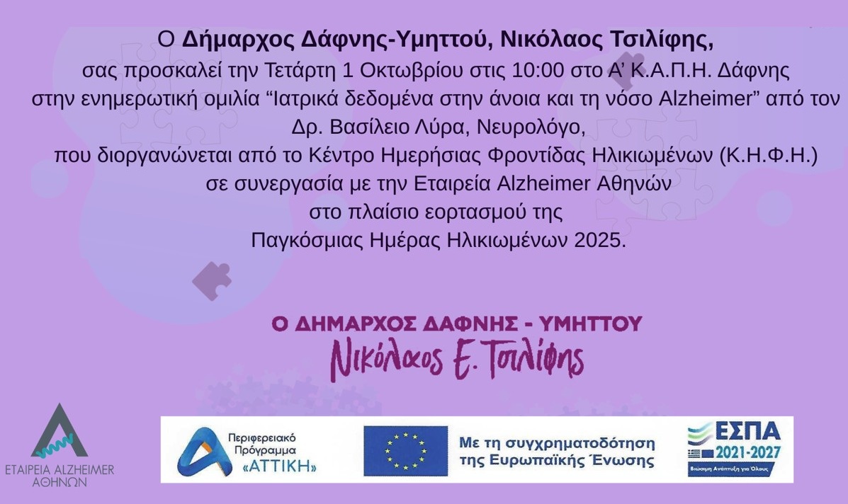 Ενημερωτική ομιλία «Ιατρικά δεδομένα στην άνοια και τη νόσο Alzheimer» του Κ.Η.Φ.Η. σε συνεργασία με την Εταιρεία Alzheimer Αθηνών | Τετάρτη 1.10.2025 | 10.00 | Α’ Κ.Α.Π.Η. Δάφνης