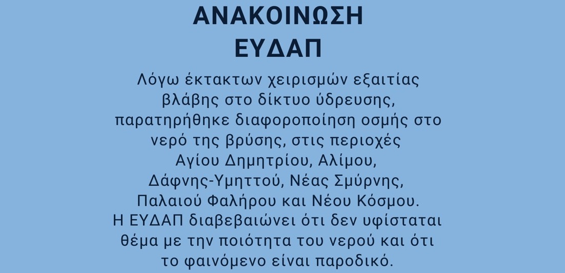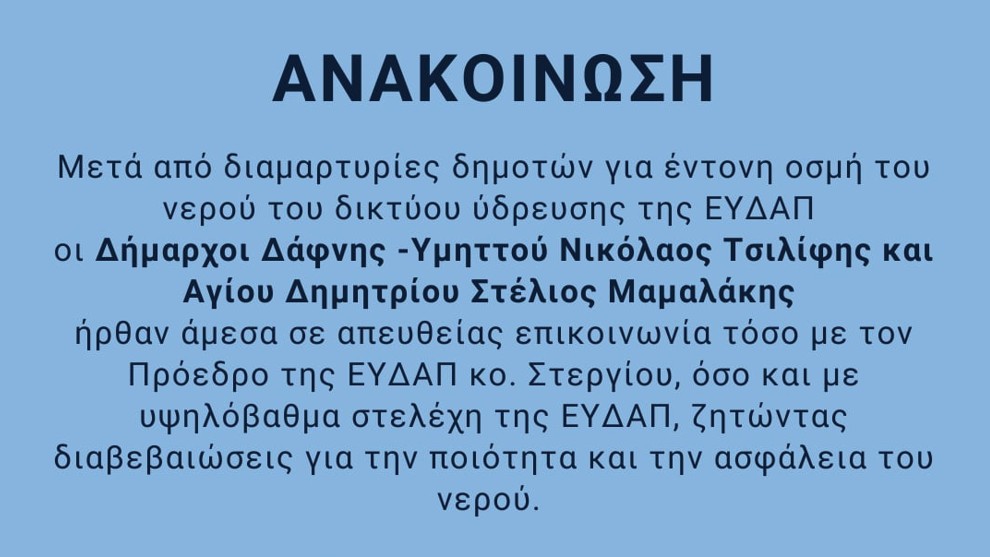 Ετικέτες: Ενημέρωση, Ανακοίνωση, Δήμος Δάφνης - Υμηττού, Γραφείο Δημάρχου, Δημότες, Πολίτες, Γραφείο τύπου, Νικόλαος Ε. Τσιλίφης, ΕΥΔΑΠ