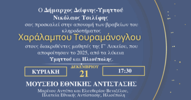 Αντικατάσταση Προέδρου της Δημοτικής Επιτροπής Διαβούλευσης, λόγω εκλογής νέου Προεδρείου του Δημοτικού ΣυμβουλίουΔημοσίευση: 3 Μαρτίου 2022, 11:34← Έγκριση διόρθωσης αποφάσεων του Δημοτικού Συμβουλίου που αφορούν χορήγηση-ανανέωση θέσεων στάθμευσης μη αναπηρικών οχημάτων, κατόπιν εισήγησης της Επιτροπής Ποιότητας ΖωήςΑποδοχή επιχορήγησης ποσού για την κάλυψη δαπάνης μισθοδοσίας προσωπικού καθαριότητας με σχέση εργασίας ιδιωτικού δικαίου →Ίσως Σας ΕνδιαφέρειΗ Φιλαρμονική Κυνοπιαστών Κέρκυρας θα πλημμυρίσει χριστουγεννιάτικες μελωδίες την πόλη μας Παιδικό εικαστικό δρώμενο | Κυριακή 21.12 | 11:30 | Πλατεία Δημαρχείου ΔάφνηςΒραβείο Χαράλαμπου Τουραμάνογλου | 21 Δεκεμβρίου 2025 | 17:30