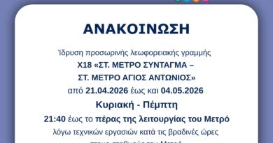 Προσωρινή λεωφορειακή γραμμή Χ18 « ΣΤ. ΜΕΤΡΟ ΣΥΝΤΑΓΜΑ – ΣΤ. ΜΕΤΡΟ ΑΓΙΟΣ ΑΝΤΩΝΙΟΣ» | 21.04.2026  – 04.05.2026 | Κυριακή έως Πέμπτη | 21:40 έως το πέρας λειτουργίας Μετρό