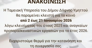 Καθορισμός α) δικαιούχου χρήσης υπηρεσιών κινητής τηλεφωνίας και β) ανώτατου επιτρεπτού χρηματικού ορίου κλήσεων για κάθε μήνα για το έτος 2019Δημοσίευση: 20 Φεβρουαρίου 2019, 16:09← Αποδέσμευση ποσών ΣΑΤΑ για πληρωμή λειτουργικών δαπανώνΈνταξη έργων σε πιστώσεις ΣΑΤΑ →Ίσως Σας Ενδιαφέρει✨ Εορταστικό Τριήμερο στην Πλατεία Δημαρχείου Δάφνης ✨Αναβολή σημερινής δράσης λόγω δυσμενών καιρικών συνθηκώνΑνακοίνωση | Κλειστή η Ταμειακή Υπηρεσία του Δήμου από 02.01 – 21.01.2026
