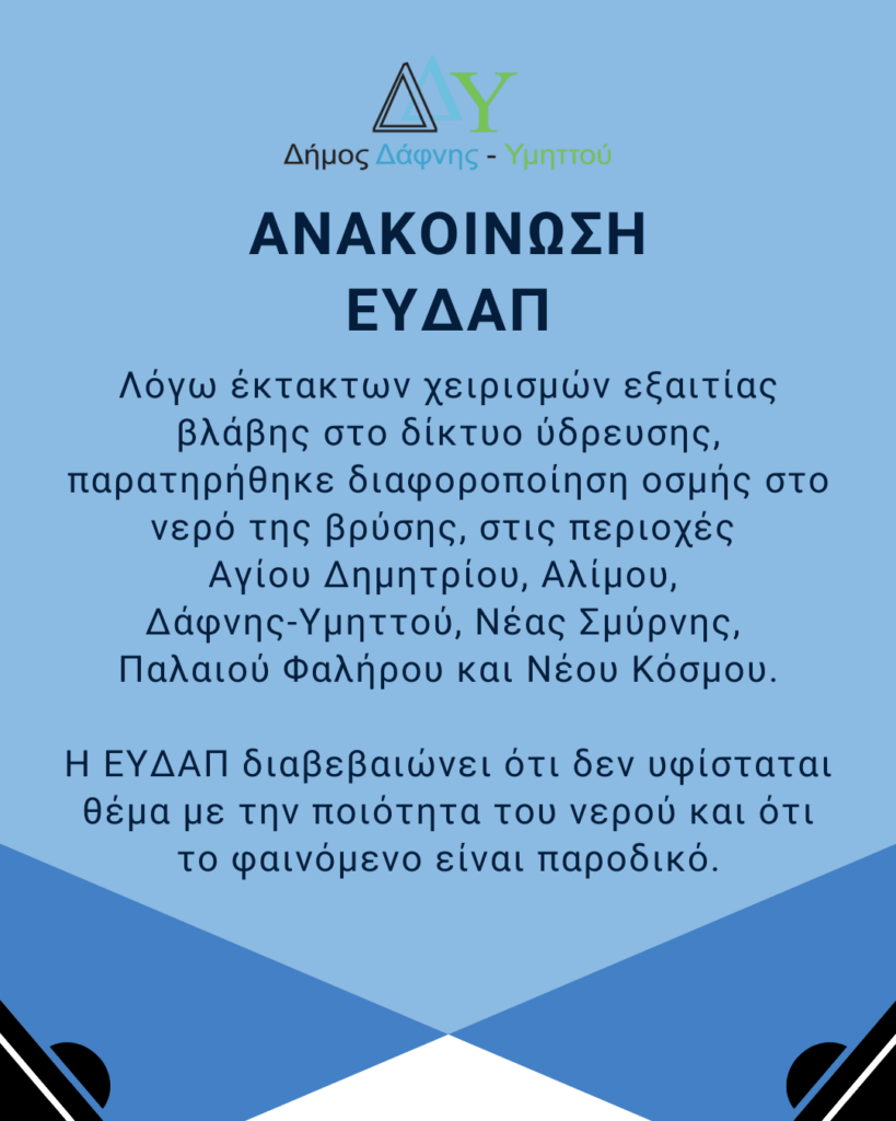 ΓΡΑΦΕΙΟ ΤΥΠΟΥ | ΑΝΑΚΟΙΝΩΣΕΙΣ ΤΕΛΕΥΤΑΙΑ ΝΕΑ ΓΡΑΦΕΙΟ ΔΗΜΑΡΧΟΥ | ΑΝΑΚΟΙΝΩΣΕΙΣ ΝΕΟ! Ενημέρωση ΕΥΔΑΠ σχετικά με την ποιότητα του νερούΕνημέρωση,ποιότητα νερού,Δελτίο τύπου,Ανακοίνωση,Δήμος Δάφνης - Υμηττού,Γραφείο Δημάρχου,Δημότες,Πολίτες,Γραφείο τύπου,ΕΥΔΑΠΔημοσίευση: 1 Οκτωβρίου 2025, 10:08 Κατεβάστε και δείτε το δελτίο τύπου εδώ