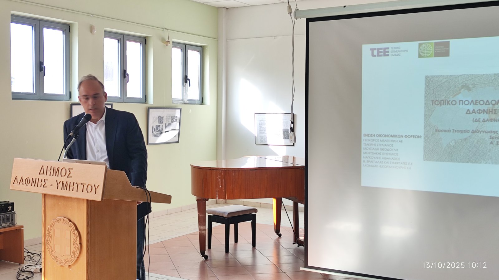Τη Δευτέρα 13 Οκτωβρίου 2025 και ώρα 10:00 π.μ., πραγματοποιήθηκε με επιτυχία στην αίθουσα του πρώην Δημαρχείου Υμηττού η δημοσιοποίηση των Εναλλακτικών Σεναρίων Χωρικής Ανάπτυξης του Τοπικού Πολεοδομικού Σχεδίου (ΤΠΣ) του Δήμου Δάφνης-Υμηττού (Α’ Φάση).