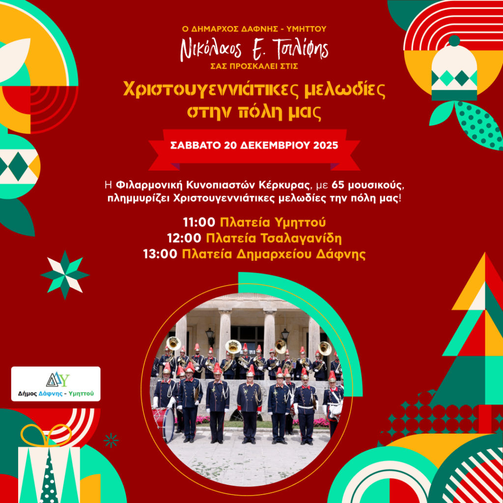 Οι 65 μουσικοί της Φιλαρμονικής θα πλημμυρίσουν τους δρόμους της Δάφνης και του Υμηττού με χριστουγεννιάτικες μελωδίες, παίζοντας ζωντανά κλασικές και χριστουγεννιάτικες μελωδίες σε γειτονιές και πλατείες, το Σάββατο 20 Δεκεμβρίου και την Κυριακή 21 Δεκεμβρίου από τις 11:00.