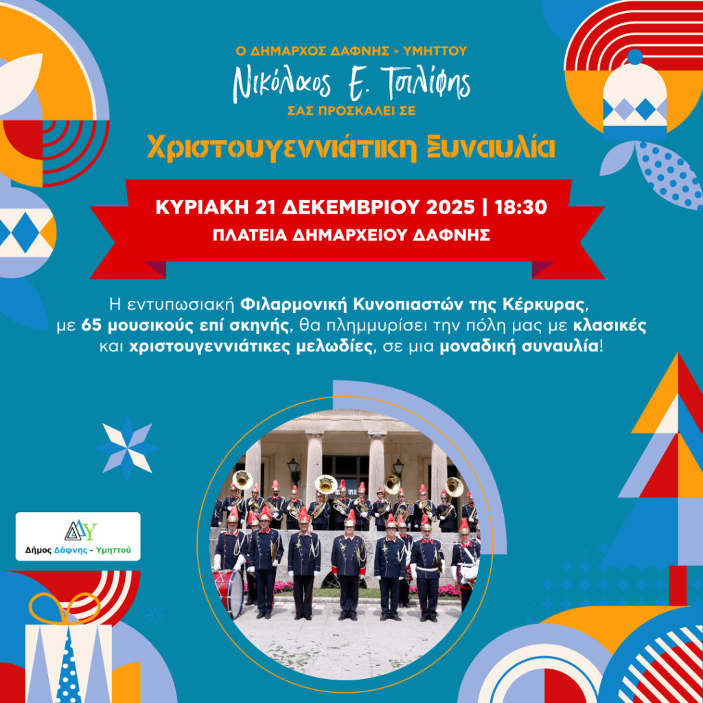 Η εντυπωσιακή Φιλαρμονική Κυνοπιαστών της Κέρκυρας, με 65 μουσικούς επί σκηνής, θα πλημμυρίσει την πόλη μας με κλασικές και χριστουγεννιάτικες μελωδίες, σε μια μοναδική συναυλία την Κυριακή στις 18:30 στην Πλατεία Δημαρχείου Δάφνης!