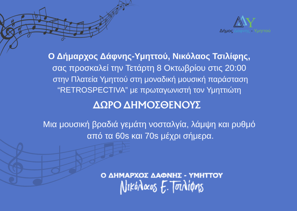 Ο Δώρος Δημοσθένους στον Δήμο Δάφνης-Υμηττού με το μουσικό ταξίδι “RETROSPECTIVA” | Τετάρτη 8 Οκτωβρίου 2025 | 20:00 | Πλατεία Υμηττού