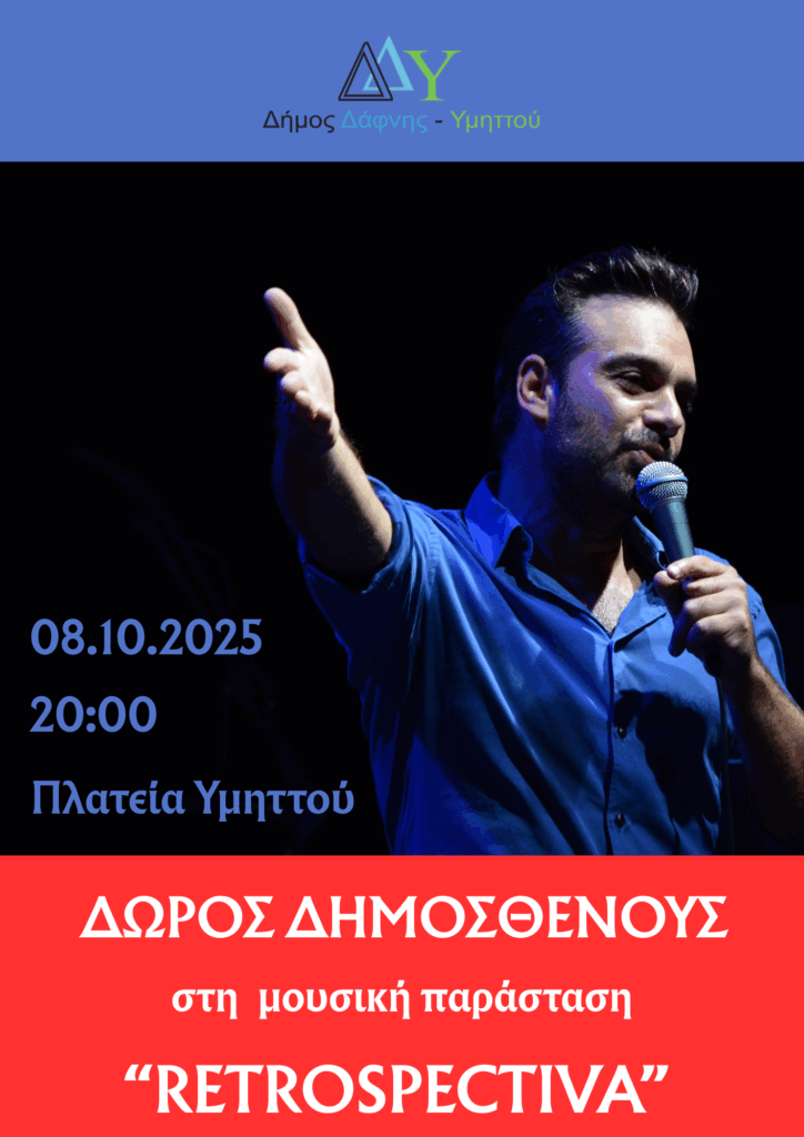 Ο Δώρος Δημοσθένους έρχεται για πρώτη φορά να τραγουδήσει στην Πλατεία Υμηττού, τη γειτονιά όπου ζει και αγαπά. Με την υπέροχη φωνή του θα μας ταξιδέψει, μικρούς και μεγάλους, στη μουσική παράσταση “RETROSPECTIVA” την Τετάρτη 8 Οκτωβρίου 2025 στις 20:00.