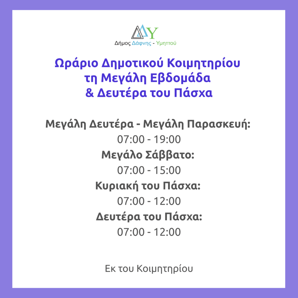 ΓΡΑΦΕΙΟ ΤΥΠΟΥ | ΑΝΑΚΟΙΝΩΣΕΙΣ ΤΕΛΕΥΤΑΙΑ ΝΕΑ ΔΗΜΟΤΙΚΟ ΚΟΙΜΗΤΗΡΙΟ ΝΕΟ! Ωράριο Δημοτικού Κοιμητηρίου τη Μεγάλη Εβδομάδα & Δευτέρα του ΠάσχαΔημότες,Πολίτες,Δημοτικό Κοιμητήριο,Πάσχα 2026,Ωράριο Δημοτικού Κοιμητηρίου,Δήμος Δάφης - Υμηττού,Ενημέρωση,ΑνακοίνωσηΔημοσίευση: 8 Απριλίου 2026, 09:59