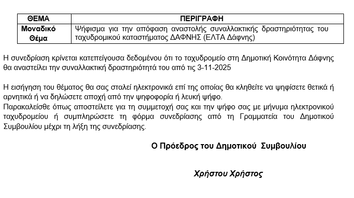 Στη 20η συνεδρίαση (έκτακτη) του Δημοτικού Συμβουλίου η οποία θα διεξαχθεί δια περιφοράς μέσω ηλεκτρονικού ταχυδρομείου την Πέμπτη 30 Οκτωβρίου 2025 με ώρα έναρξης στις 14:00 και ώρα λήξης στις 14:45, σύμφωνα με το άρθρο 67 του Ν.3852/2010 (ΦΕΚ 87/τ.Α’/07-06-2010) καθώς και το άρθ.11 του Ν.5043/2023 (υπ’αρ. 488/2023 εγκύκλιος ΥΠΕΣ) και του αριθμ. 109/τ. Β’/21-1-2025 ΦΕΚ για συζήτηση και λήψη απόφασης στο μοναδικό θέμα της ημερήσιας διάταξης: