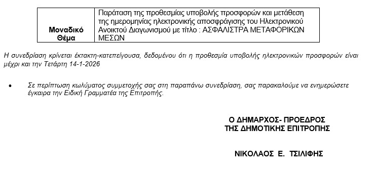Την Τρίτη 13 Ιανουαρίου 2026 σε ΕΚΤΑΚΤΗ – ΚΑΤΕΠΕΙΓΟΥΣΑ συνεδρίαση της Δημοτικής Επιτροπής που θα γίνει δια περιφοράς με ώρα έναρξης στις 14:00 και ώρα λήξης στις 14:30, για συζήτηση και λήψη απόφασης στο παρακάτω μοναδικό θέμα της ημερήσιας διάταξης: