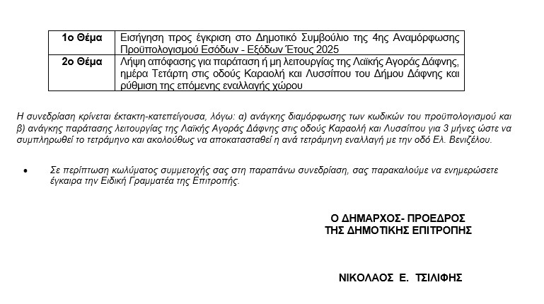 Την Πέμπτη 9 Οκτωβρίου 2025 σε ΕΚΤΑΚΤΗ – ΚΑΤΕΠΕΙΓΟΥΣΑ συνεδρίαση της Δημοτικής Επιτροπής που θα γίνει δια περιφοράς με ώρα έναρξης στις 11:00 και ώρα λήξης στις 12:00, για συζήτηση και λήψη απόφασης στα παρακάτω θέματα της ημερήσιας διάταξης: