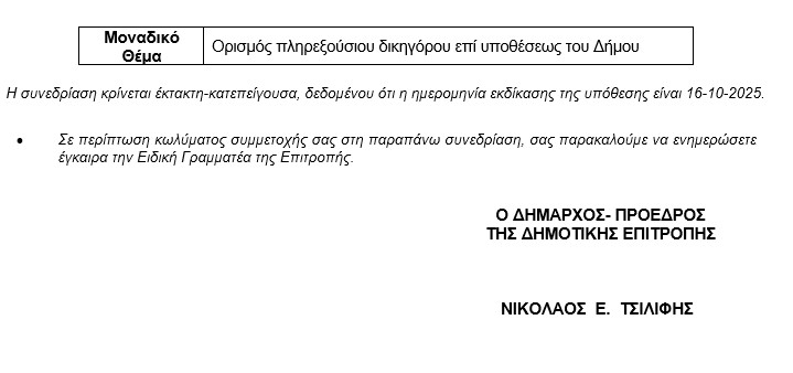39η Πρόσκληση ΕΚΤΑΚΤΗΣ – ΚΑΤΕΠΕΙΓΟΥΣΑΣ ΔΙΑ ΠΕΡΙΦΟΡΑΣ Συνεδρίασης Δημοτικής Επιτροπής την 15.10.2025 και ώρα 09:00 με 10:00