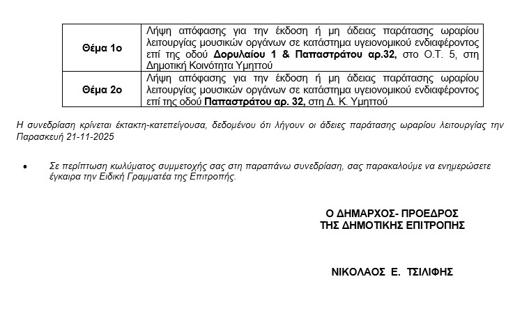 44η Πρόσκληση ΕΚΤΑΚΤΗΣ – ΚΑΤΕΠΕΙΓΟΥΣΑΣ ΔΙΑ ΠΕΡΙΦΟΡΑΣ Συνεδρίασης Δημοτικής Επιτροπής την 20.11.2025 και ώρα 13:00 με 14:00