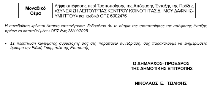 Την Πέμπτη 27 Νοεμβρίου 2025 σε ΕΚΤΑΚΤΗ – ΚΑΤΕΠΕΙΓΟΥΣΑ συνεδρίαση της Δημοτικής Επιτροπής που θα γίνει δια περιφοράς με ώρα έναρξης στις 09:30 και ώρα λήξης στις 10:30, για συζήτηση και λήψη απόφασης στο παρακάτω μοναδικό θέμα της ημερήσιας διάταξης: