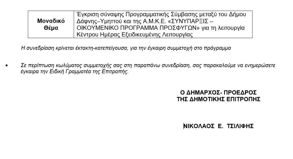 Την Πέμπτη 26 Φεβρουαρίου 2026 σε ΕΚΤΑΚΤΗ – ΚΑΤΕΠΕΙΓΟΥΣΑ συνεδρίαση της Δημοτικής Επιτροπής που θα γίνει δια περιφοράς με ώρα έναρξης στις 14:00 και ώρα λήξης στις 15:00, για συζήτηση και λήψη απόφασης στο παρακάτω μοναδικό θέμα της ημερήσιας διάταξης: