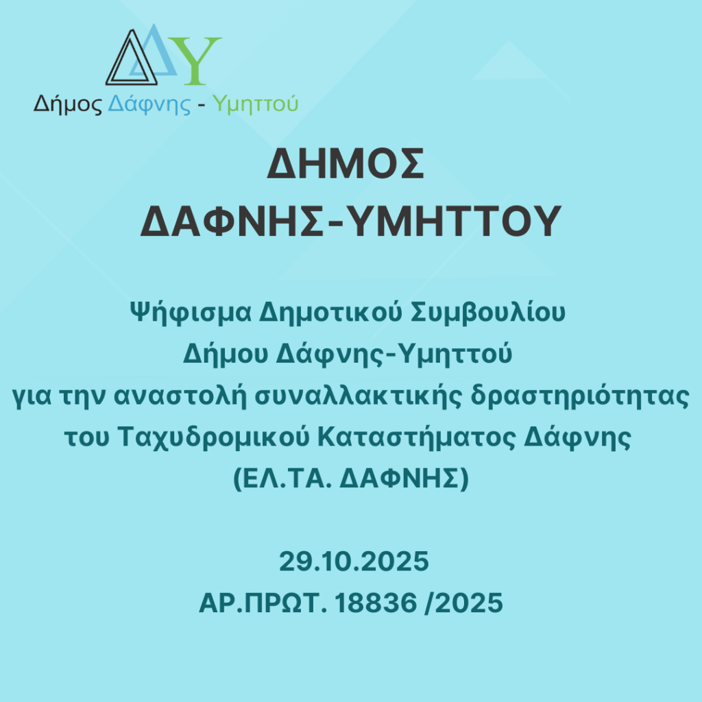 Το Δημοτικό Συμβούλιο Δάφνης Υμηττού εκφράζει την κατηγορηματική του αντίθεση στην απόφαση για το κλείσιμο του μοναδικού καταστήματος των ΕΛΤΑ στην πόλη μας, μετά και το κλείσιμο του ΕΛ.ΤΑ. στην Κοινότητα Υμηττού, τον Ιανουάριο 2020.