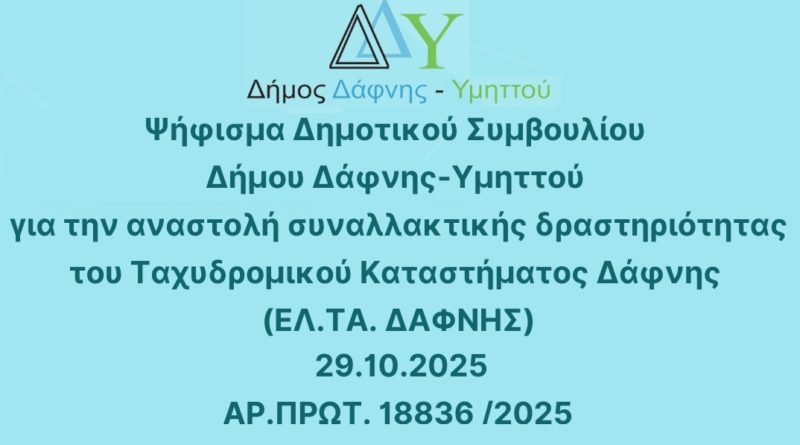 Ψήφισμα Δημοτικού Συμβουλίου Δήμου Δάφνης-Υμηττού για την αναστολή συναλλακτικής δραστηριότητας του Ταχυδρομικού Καταστήματος Δάφνης (ΕΛ.ΤΑ. ΔΑΦΝΗΣ)