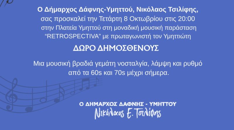 Ο Δώρος Δημοσθένους στον Δήμο Δάφνης-Υμηττού με το μουσικό ταξίδι “RETROSPECTIVA” | Τετάρτη 8 Οκτωβρίου 2025 | 20:00 | Πλατεία Υμηττού