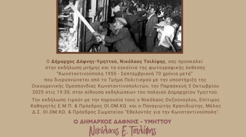 Εκδήλωση Μνήμης & Εγκαίνια Φωτογραφικής Έκθεσης “Κωνσταντινούπολη 1955 – Σεπτεμβριανά …70 χρόνια μετά” | 3.10.2025 | 19:30