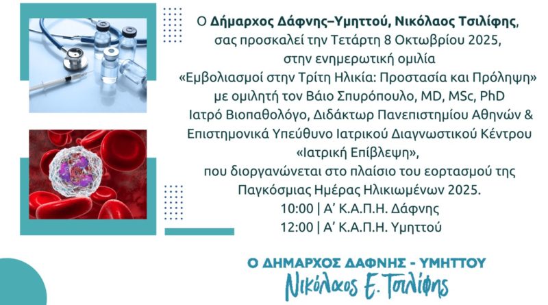 Eνημερωτική Oμιλία με θέμα «Εμβολιασμοί στην Τρίτη Ηλικία: Προστασία και Πρόληψη» | 8.10.2025 | 10:00 Α’ Κ.Α.Π.Η. Δάφνης & 12:00 Α’ Κ.Α.Π.Η. Υμηττού