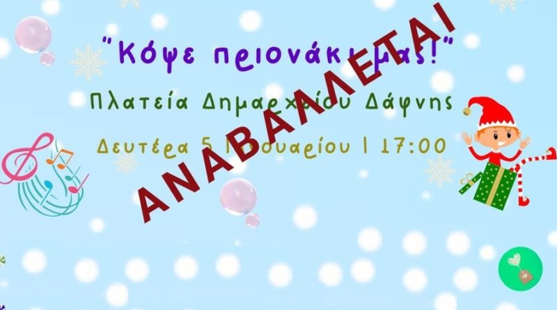 Δημοσίευση: 5 Ιανουαρίου 2026, 16:51 ‼️📢 𝝖𝝢𝝖𝝟𝝤𝝞𝝢𝝮𝝨𝝜 ‼️📢 Η σημερινή εκδήλωση αναβάλλεται λόγω δυσμενών καιρικών συνθηκών. Οι δράσεις θα πραγματοποιηθούν αύριο, 6 Ιανουαρίου 2026, στις 17:00, στην Πλατεία Δημαρχείου Δάφνης.   🫶Σας περιμένουμε μικρούς και