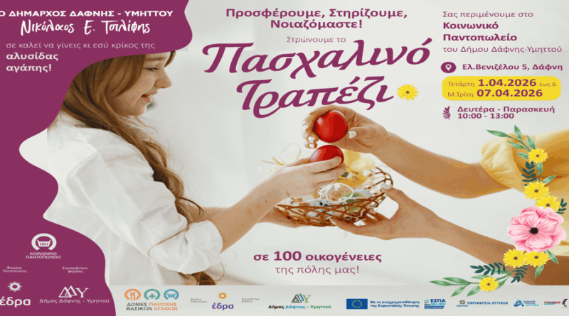 Δημοσίευση: 3 Απριλίου 2026, 12:02 Ο Δήμος Δάφνης-Υμηττού, ενόψει των ημερών του Πάσχα, διοργανώνει δράση συγκέντρωσης τροφίμων και πασχαλινών ειδών για την ενίσχυση των ωφελούμενων του Κοινωνικού Παντοπωλείου, που ανήκουν σε ευπαθείς κοινωνικές ομάδες. Με
