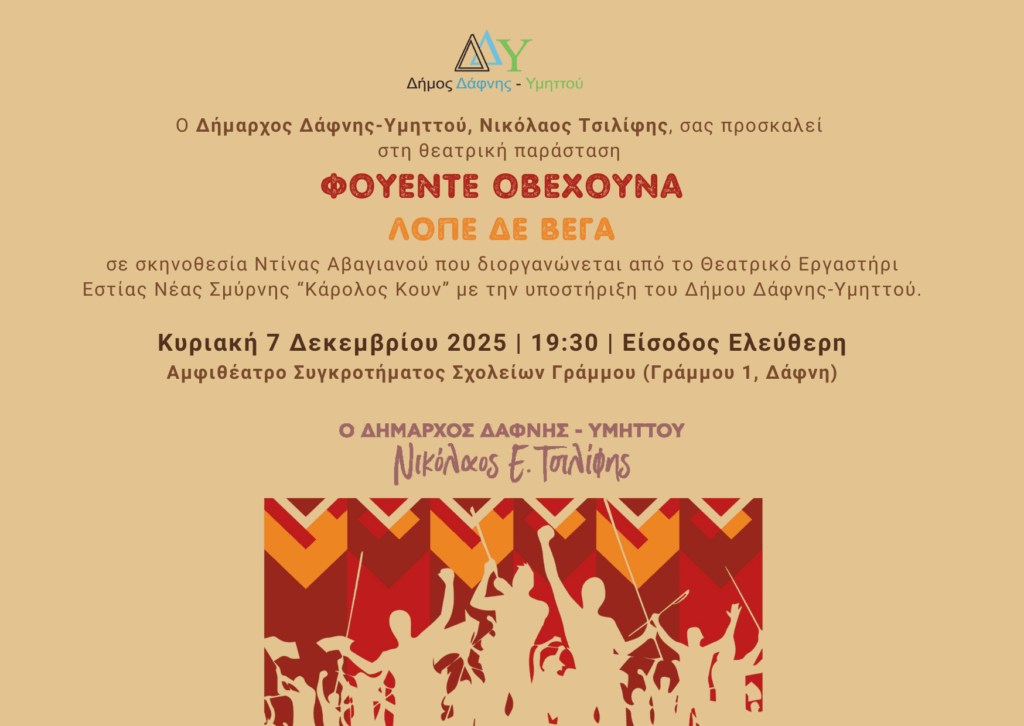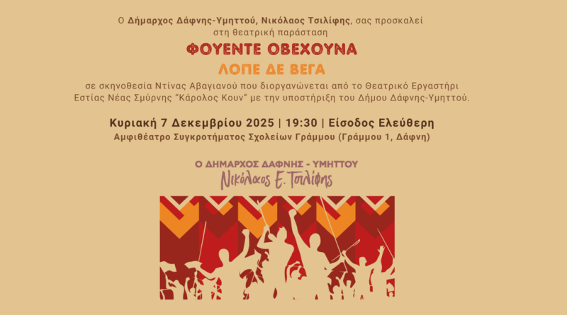 Ο Δήμος Δάφνης–Υμηττού φιλοξενεί το Θεατρικό Εργαστήρι της Εστίας Νέας Σμύρνης «Κάρολος Κουν» που παρουσιάζει τη θεατρική παράσταση «Φουέντε Οβεχούνα» του Ισπανού Λόπε δε Βέγα, έργο γραμμένο το 1614.