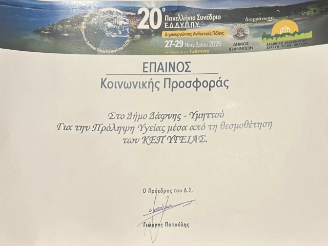 Στο 20ό Πανελλήνιο Συνέδριο του Ε.Δ.Δ.Υ.Π.Π.Υ. “Δημιουργώντας Ανθεκτικές Πόλεις” που πραγματοποιήθηκε στα Ιωάννινα, η Αντιδήμαρχος Κοινωνικής Πολιτικής και Δημόσιας Υγείας, Ανδριάνα Μαγγίτα, εκπροσωπώντας τον Δήμαρχο Νικόλαο Τσιλίφη και το ΚΕΠ Υγείας Δάφνης–Υμηττού, παρέλαβε για τον Δήμο μας Έπαινο για τη συνεχή κοινωνική προσφορά και τις ουσιαστικές δωρεάν δράσεις στην προαγωγή της Δημόσιας Υγείας.