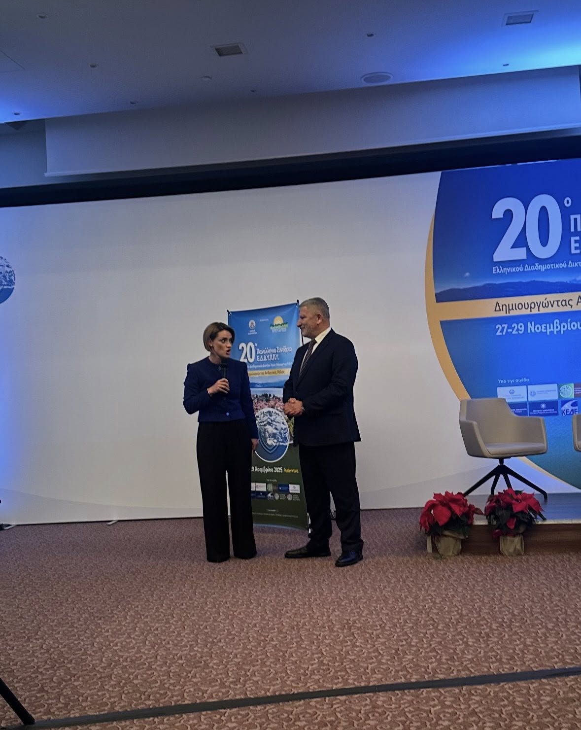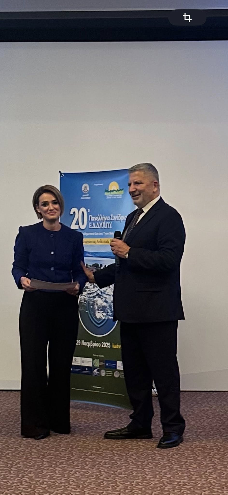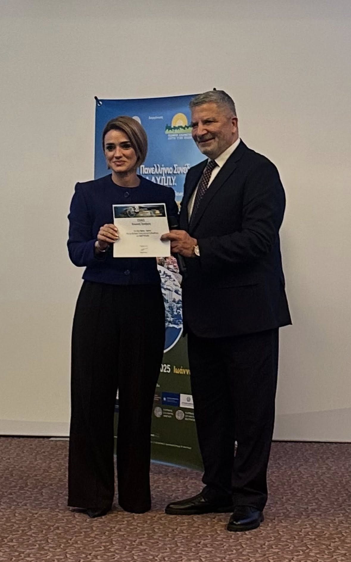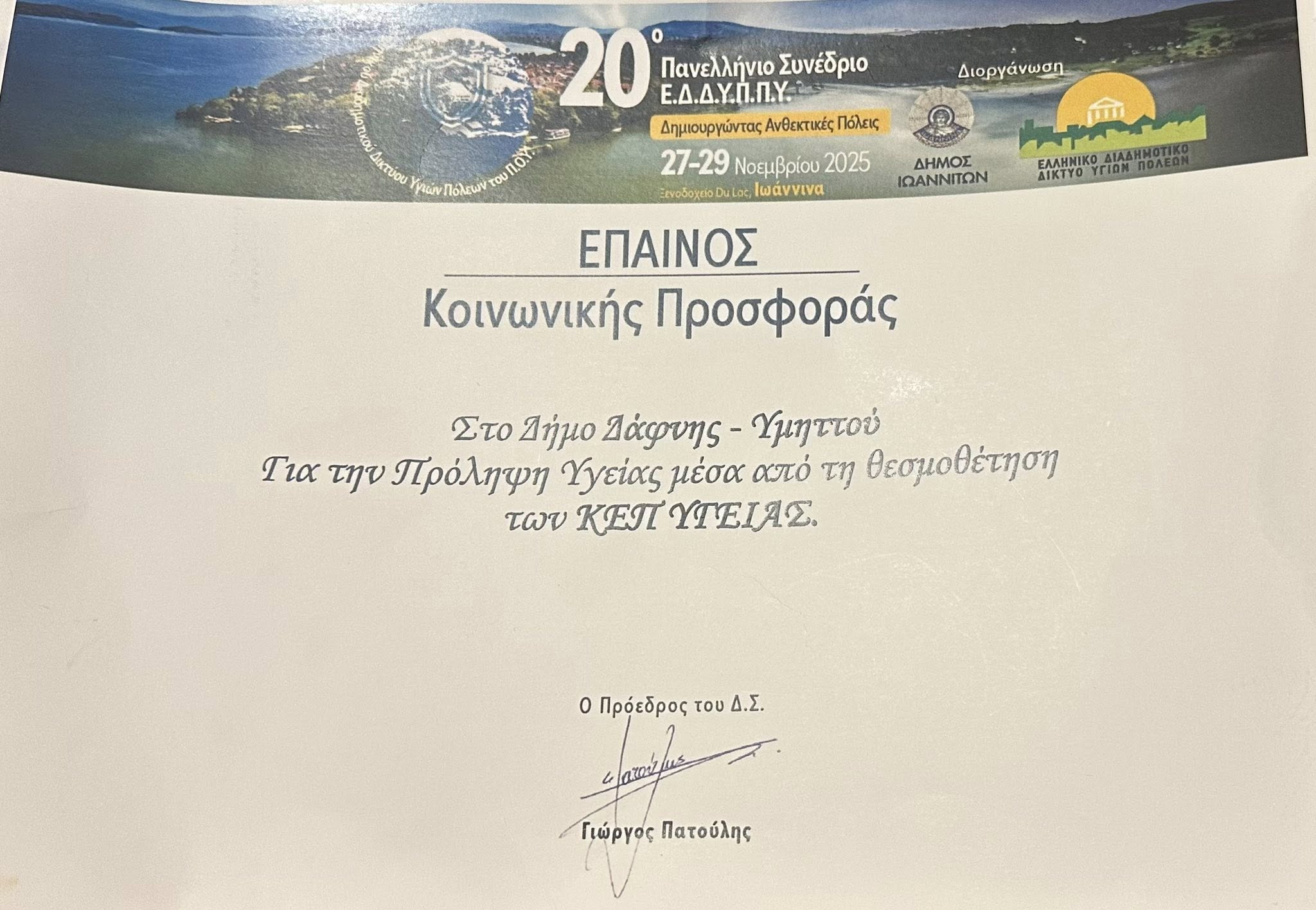 Στο 20ό Πανελλήνιο Συνέδριο του Ε.Δ.Δ.Υ.Π.Π.Υ. “Δημιουργώντας Ανθεκτικές Πόλεις” που πραγματοποιήθηκε στα Ιωάννινα, η Αντιδήμαρχος Κοινωνικής Πολιτικής και Δημόσιας Υγείας, Ανδριάνα Μαγγίτα, εκπροσωπώντας τον Δήμαρχο Νικόλαο Τσιλίφη και το ΚΕΠ Υγείας Δάφνης–Υμηττού, παρέλαβε για τον Δήμο μας Έπαινο για τη συνεχή κοινωνική προσφορά και τις ουσιαστικές δωρεάν δράσεις στην προαγωγή της Δημόσιας Υγείας.
